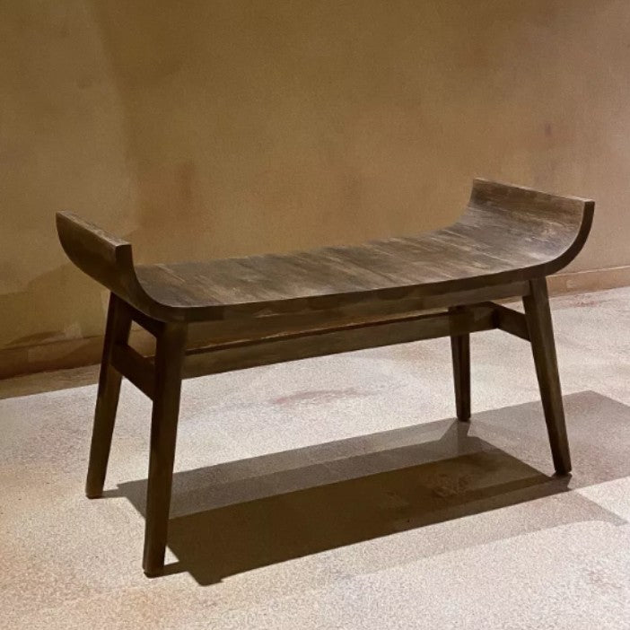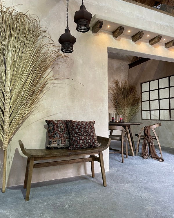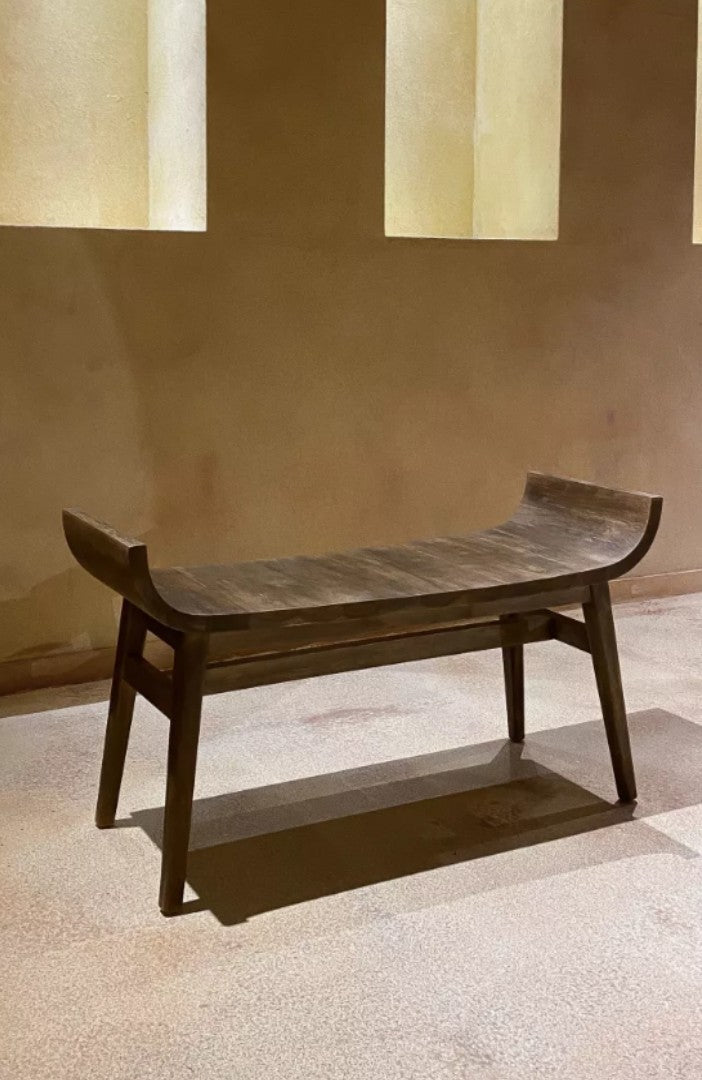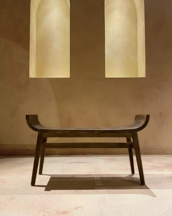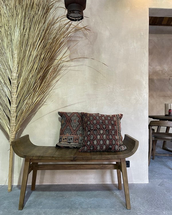 Bank Fez van Hoffz. Bank Fez is een knipoog naar kruk Fez: een vergelijkbaar ontwerp, maar met een speelse twist door de gebogen zijkanten. Hij staat mooi in een hal, bij het uiteinde van een bed of aan een eetkamertafel, zoals de Yaro ovaal.