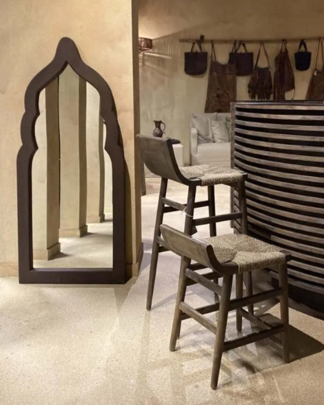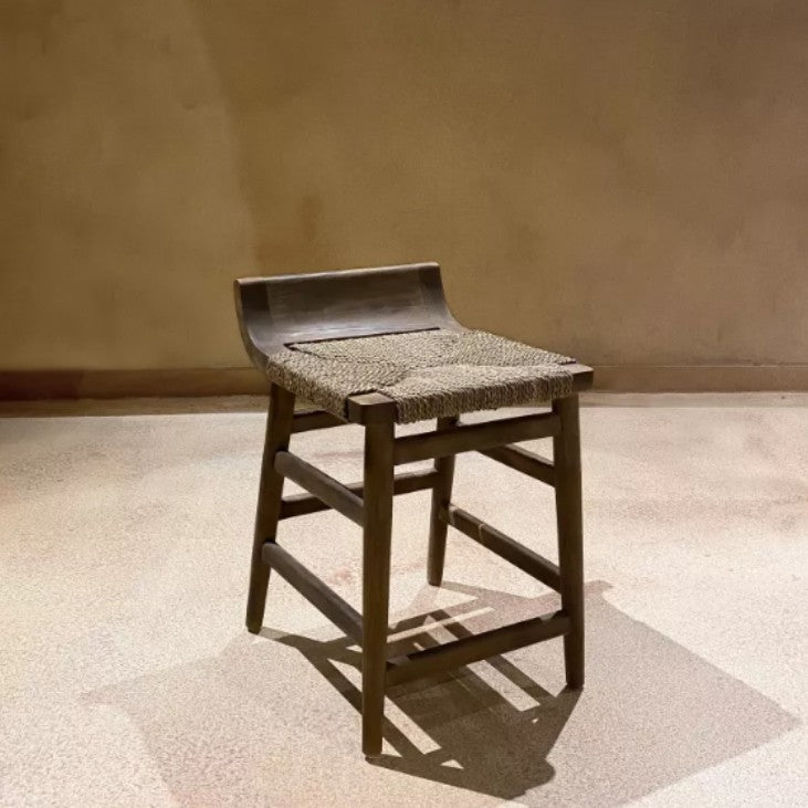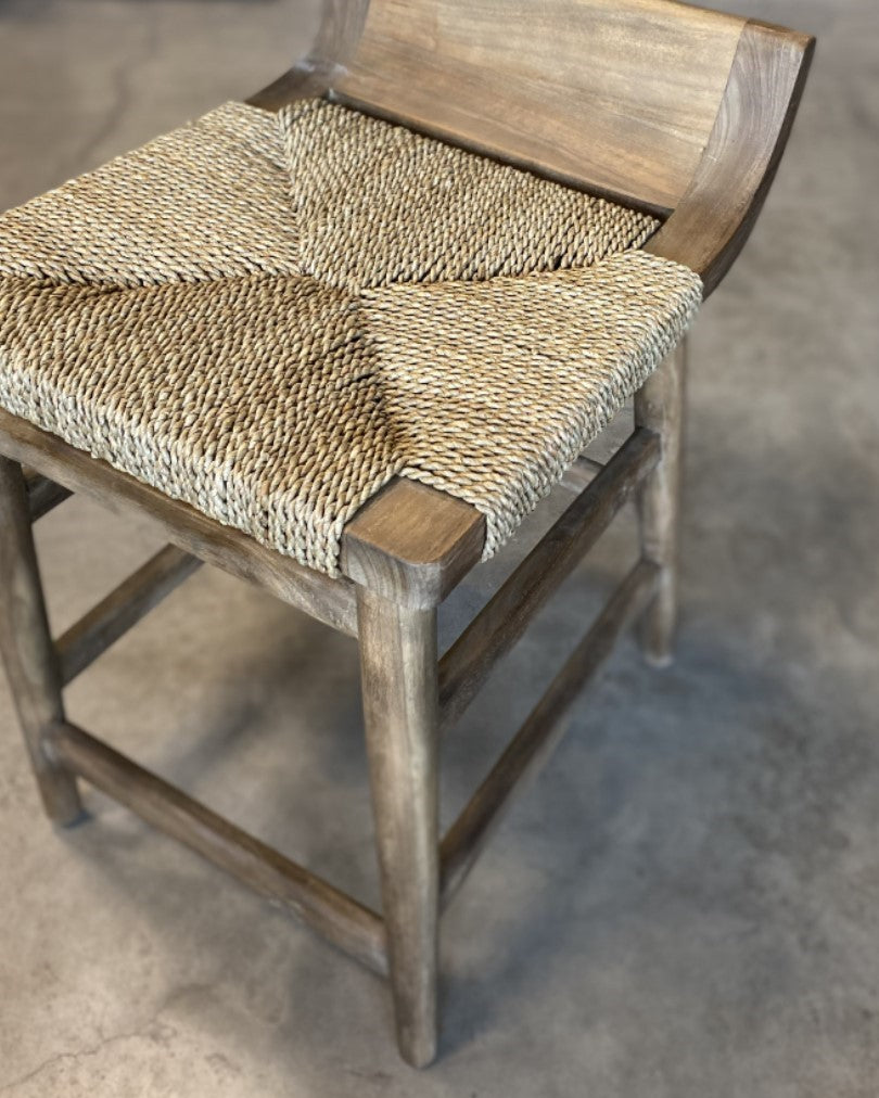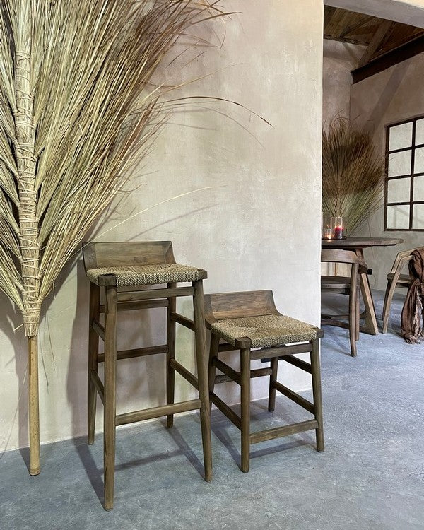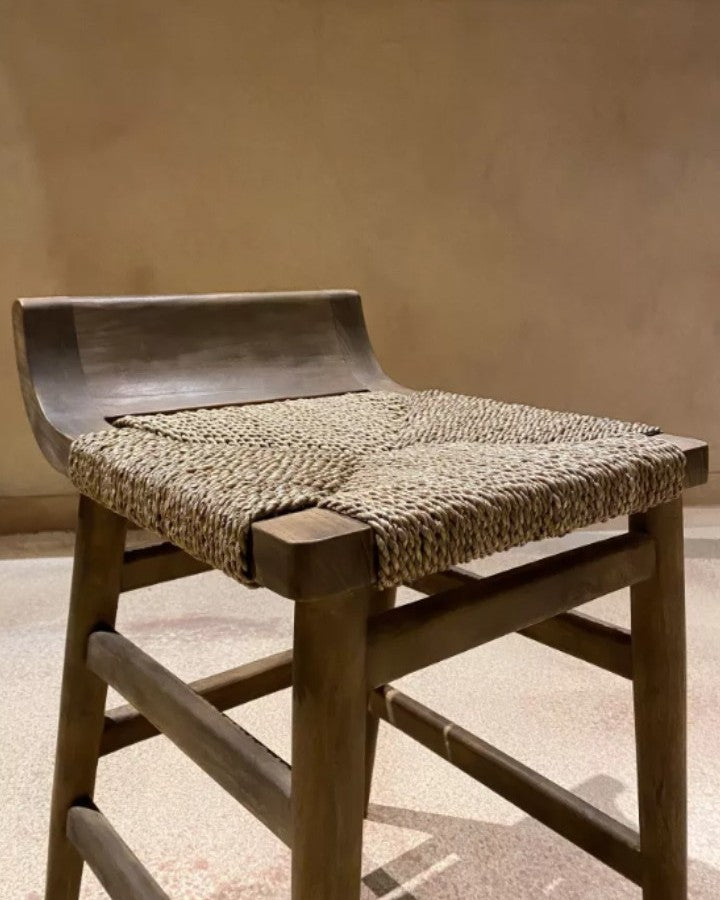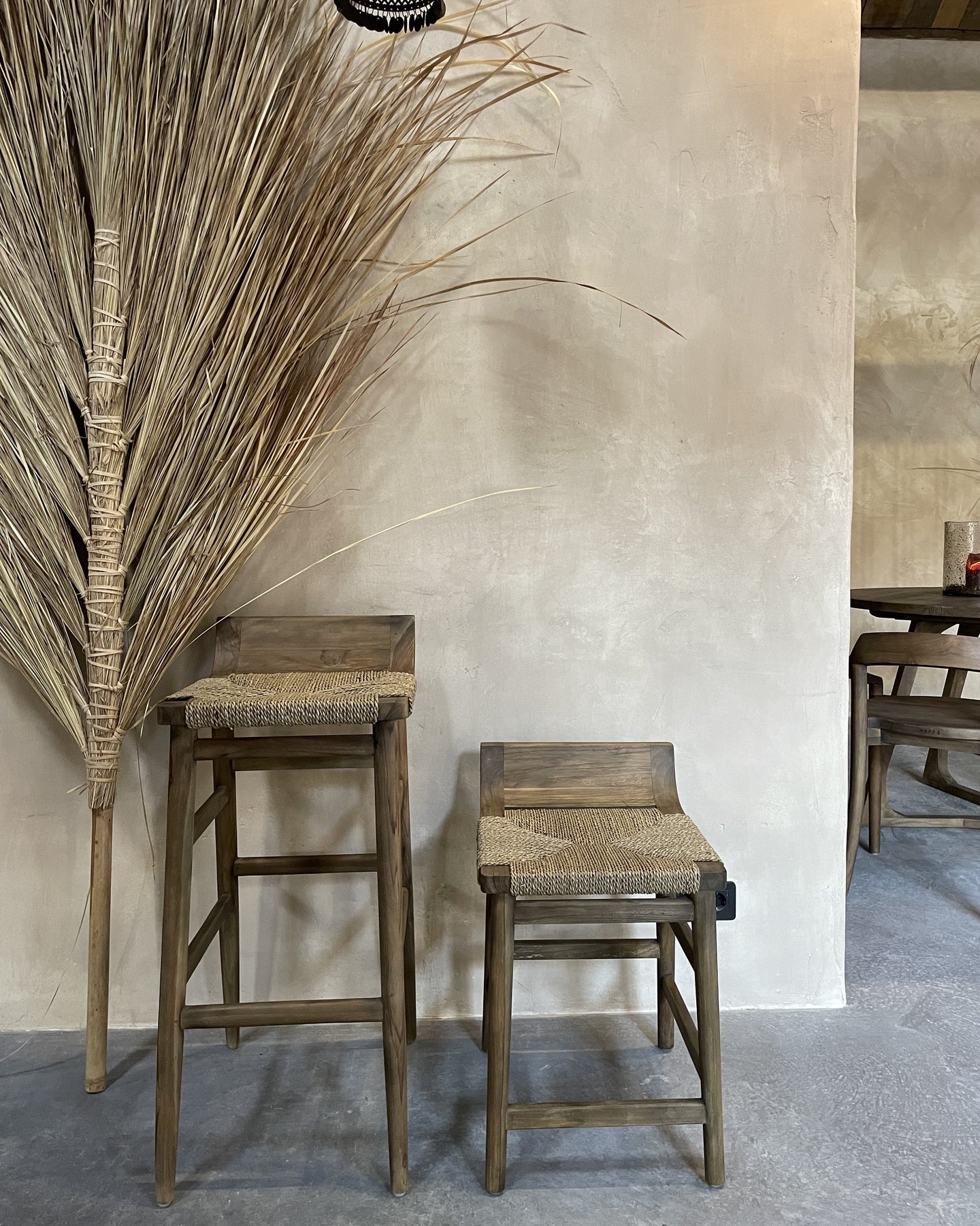 Kruk Bintu van Hoffz. Kruk Bintu is de ingekorte versie van onze barkruk Tanji. Hij is gemaakt van teak hout en het zitvlak is afgewerkt met zeegras. Mooi en praktisch als aanschuiver, of als zithoek met twee stuks geplaatst aan een kleine tafel.