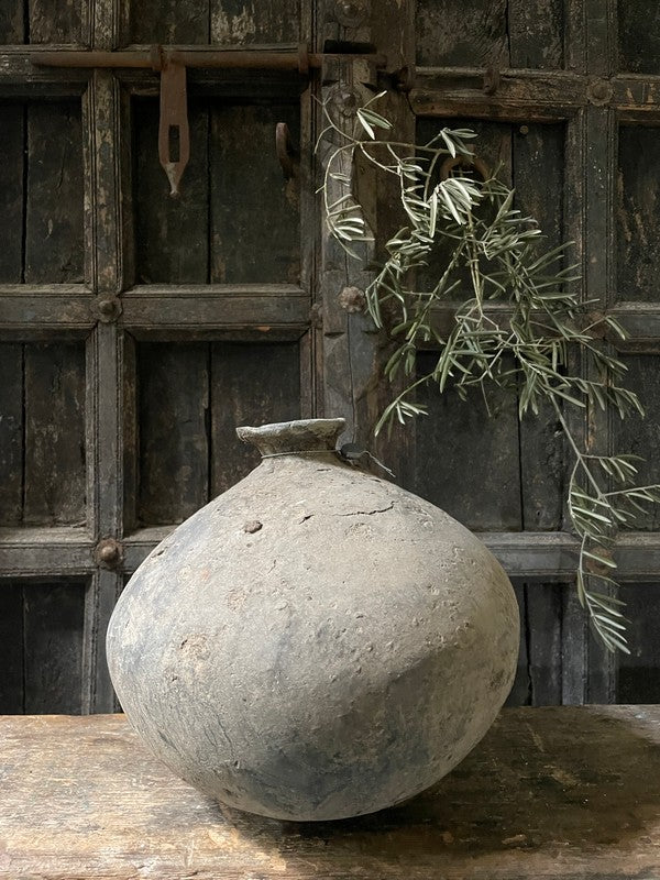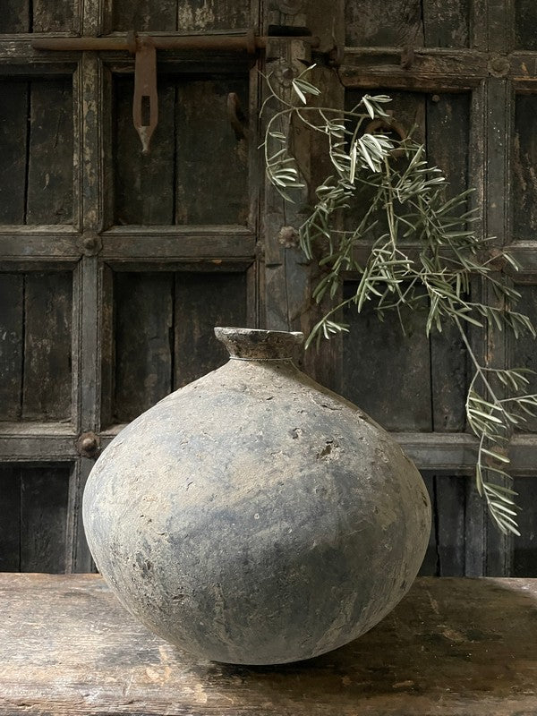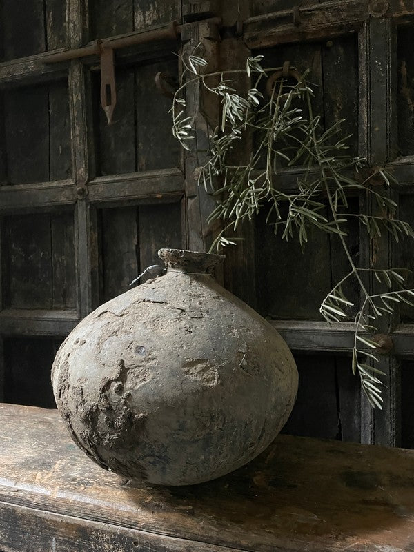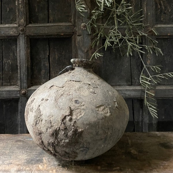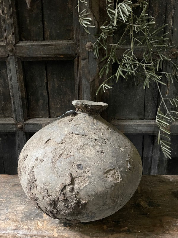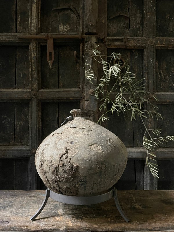 Nepalese klei kruik. Prachtige doorleefde en sobere klei kruik uit Nepal. Deze authentieke handgemaakte kruik is een stilleven op zich en heeft eigenlijk geen "opschmuck" nodig. Er zit een ijzeren ring bij waar de kruik op past, maar ook zonder ring blijft deze kruik mooi staan. Deze kruik is ook geweldig mooi om in een houten schaal te zetten/leggen. Mooi groot model!