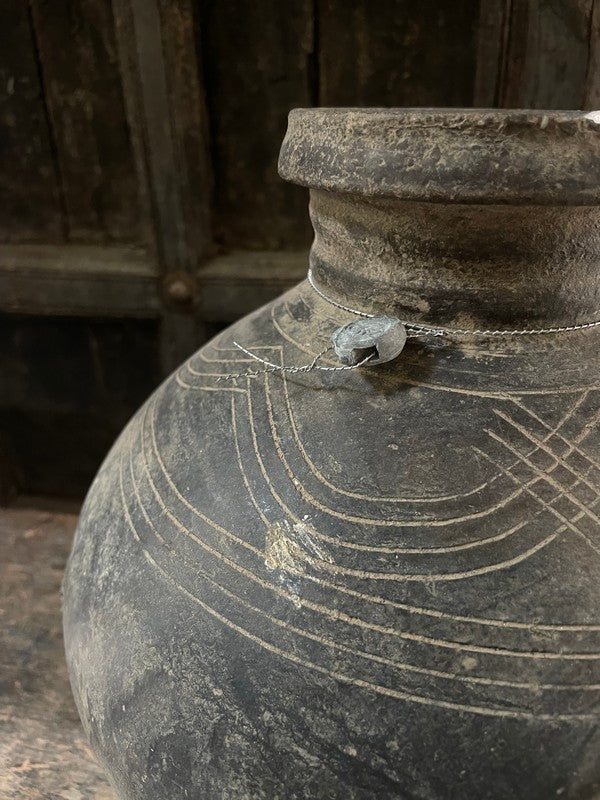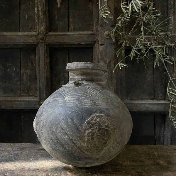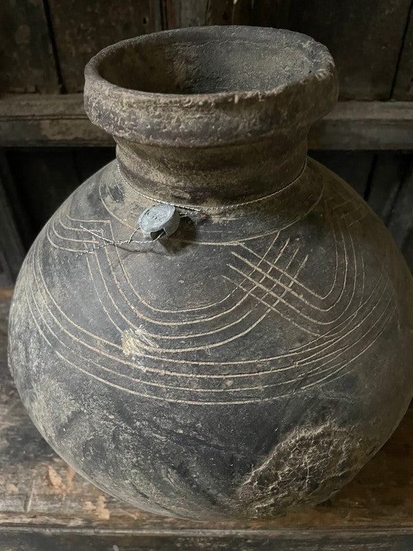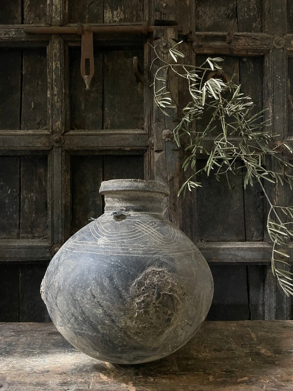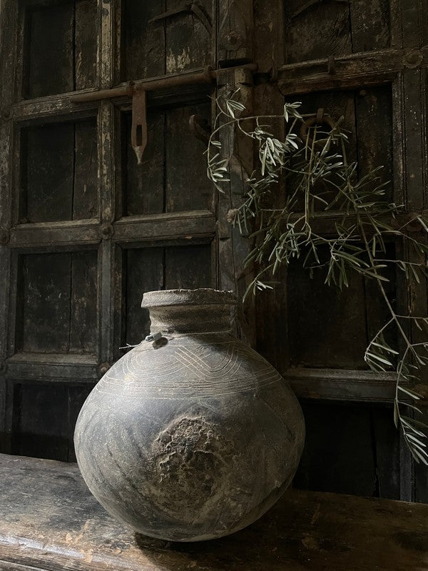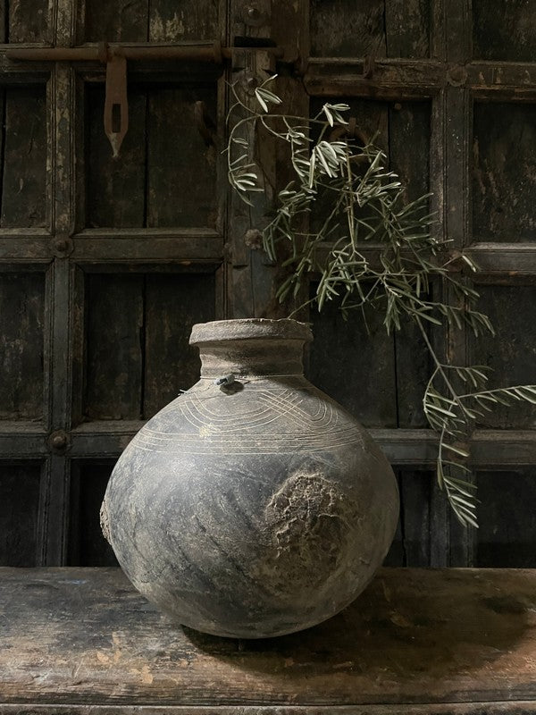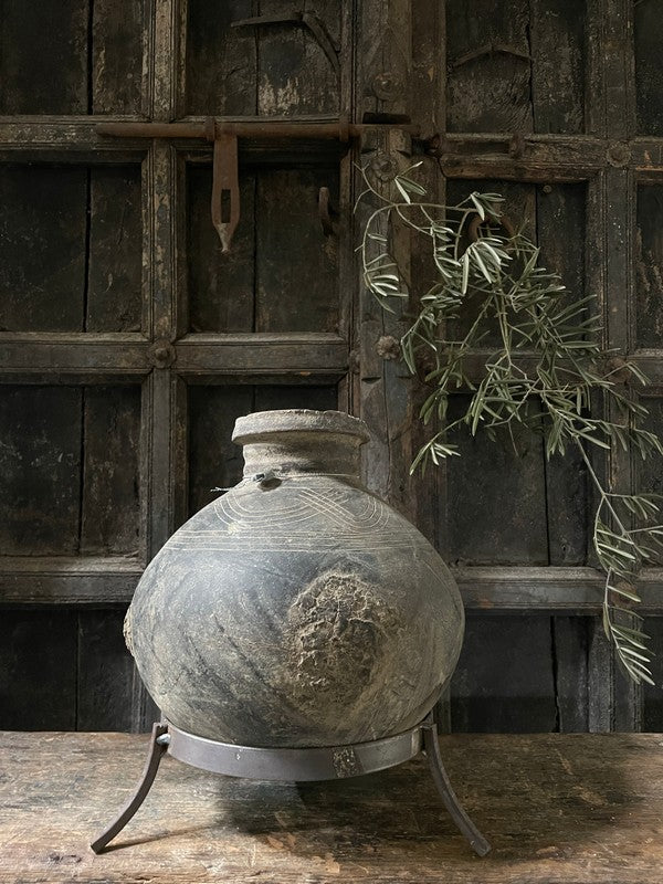 Nepalese klei kruik. Prachtige doorleefde en sobere klei kruik uit Nepal. Deze authentieke handgemaakte kruik is een stilleven op zich en heeft eigenlijk geen "opschmuck" nodig. Er zit een ijzeren ring bij waar de kruik op past, maar ook zonder ring blijft deze kruik mooi staan. Deze kruik is ook geweldig mooi om in een houten schaal te zetten/leggen. Mooi groot model!