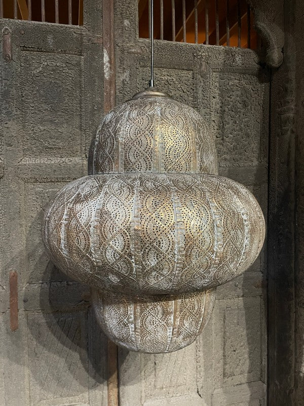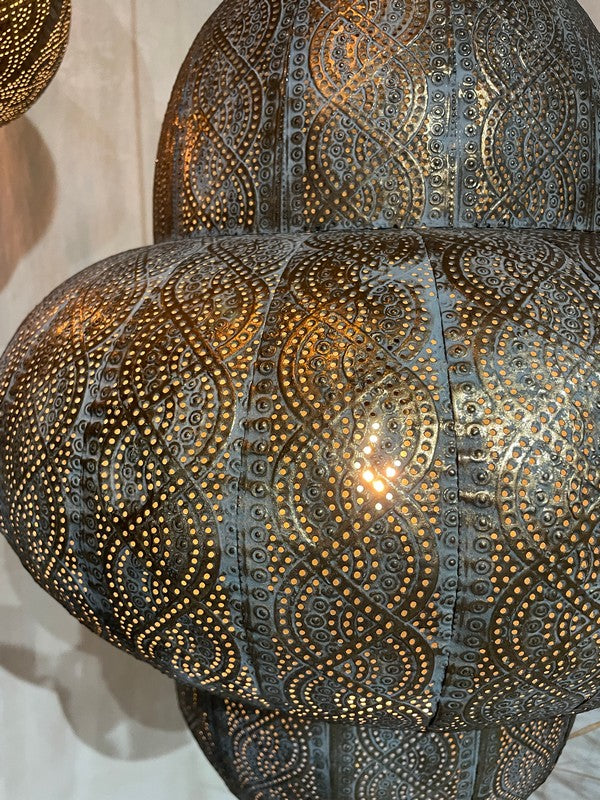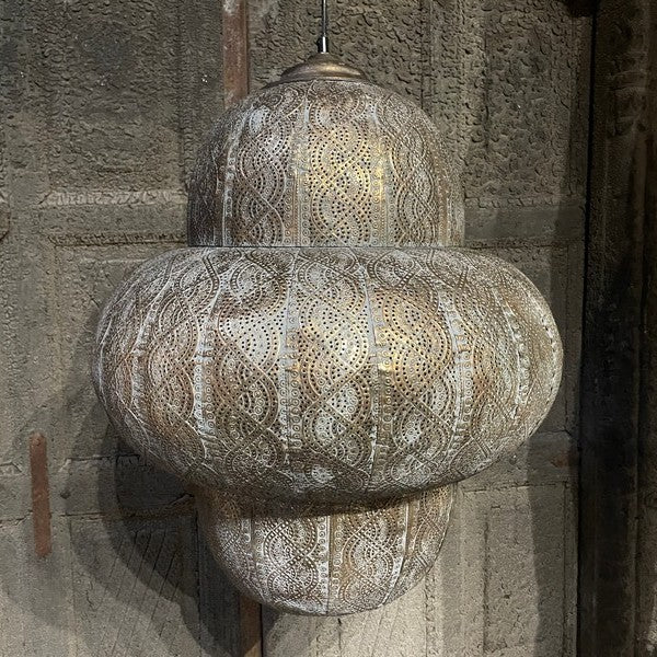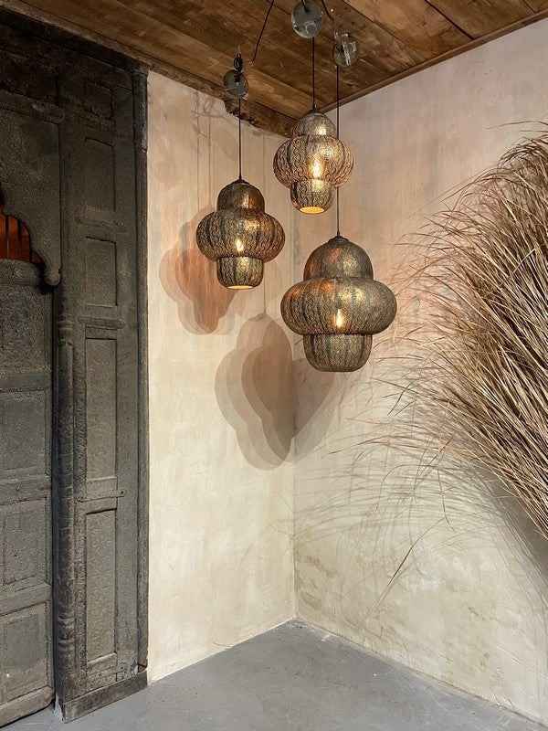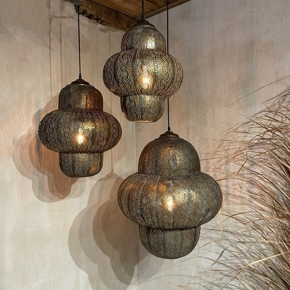 Hanglamp Oosters - Large. Sfeervolle hanglamp, waarbij het licht prachtig door de gaatjes heen schijnt. Deze metalen hanglamp heeft een bruin/goud/grijze vintage finish, met bijpassend vintage goudkleurig plafondkapje.