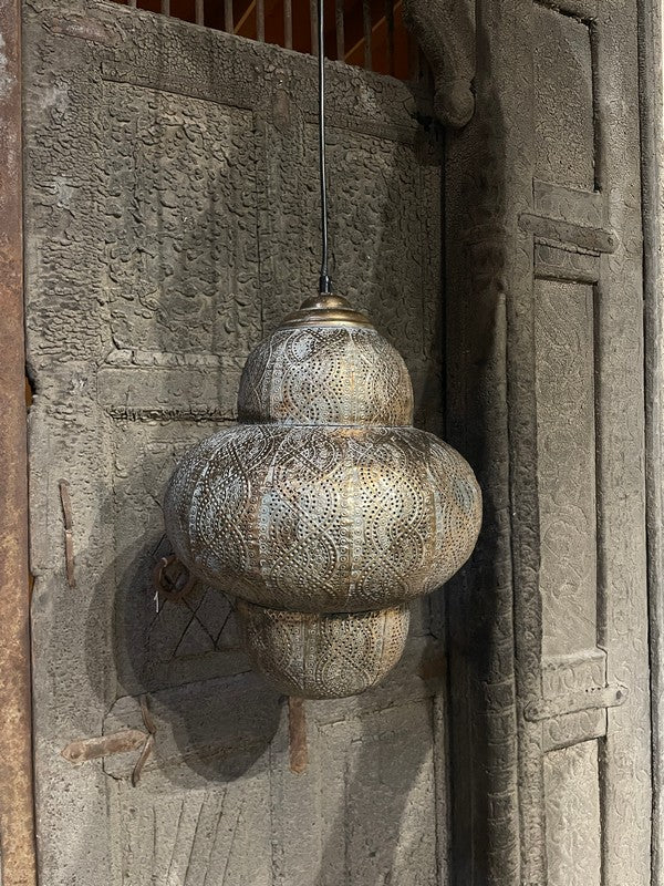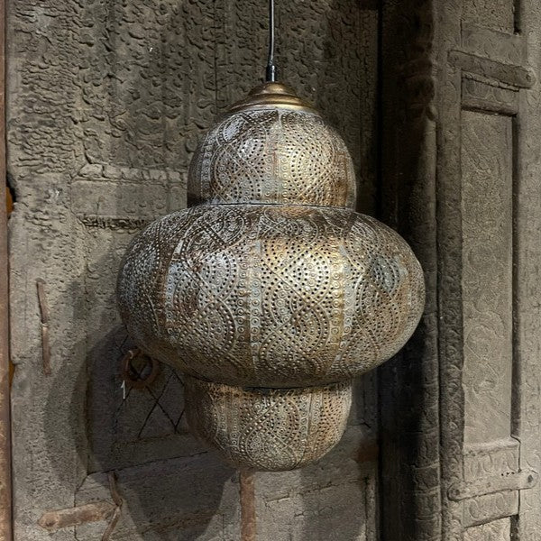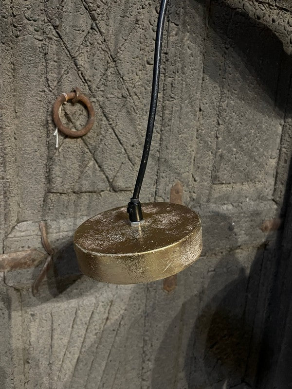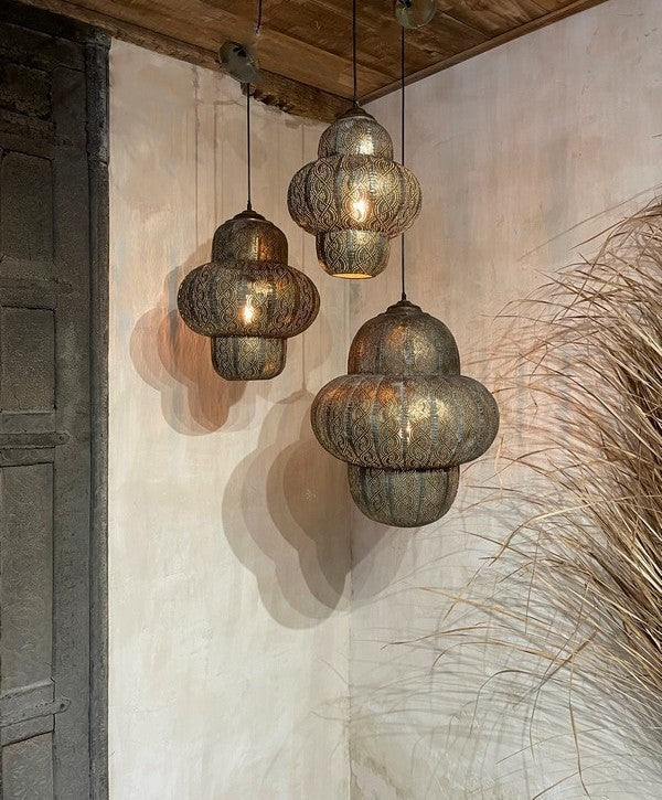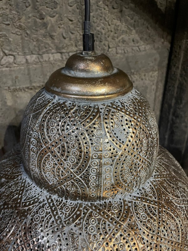 Hanglamp Oosters - Small. Sfeervolle hanglamp, waarbij het licht prachtig door de gaatjes heen schijnt. Deze metalen hanglamp heeft een bruin/goud/grijze vintage finish, met bijpassend vintage goudkleurig plafondkapje.