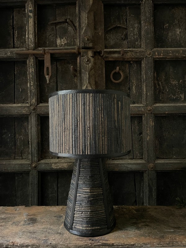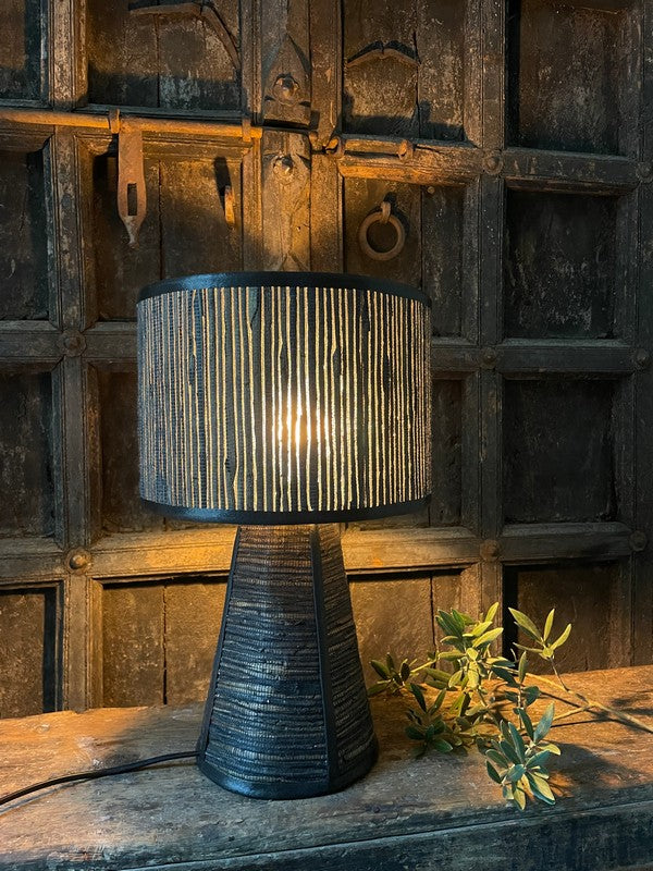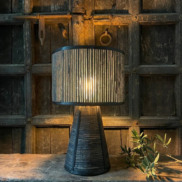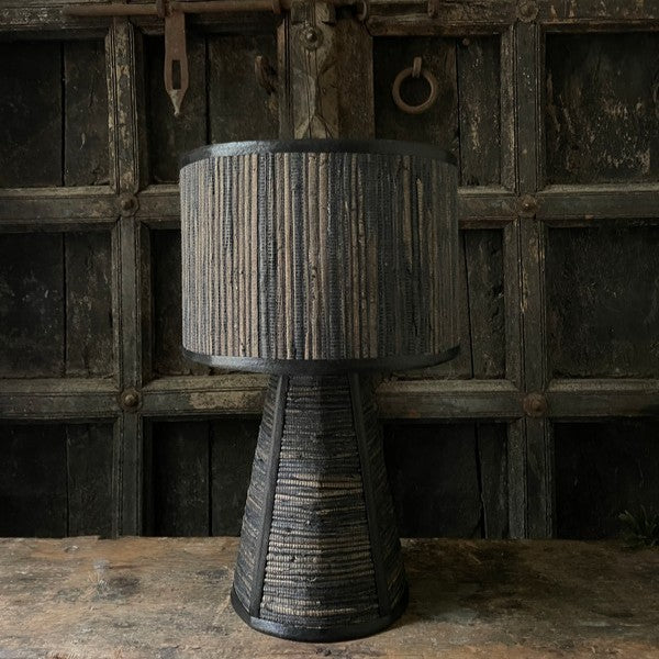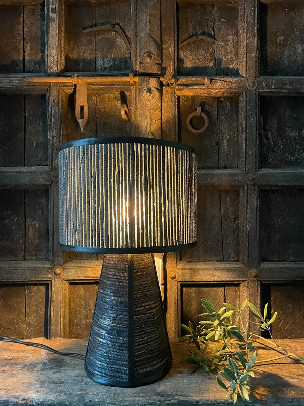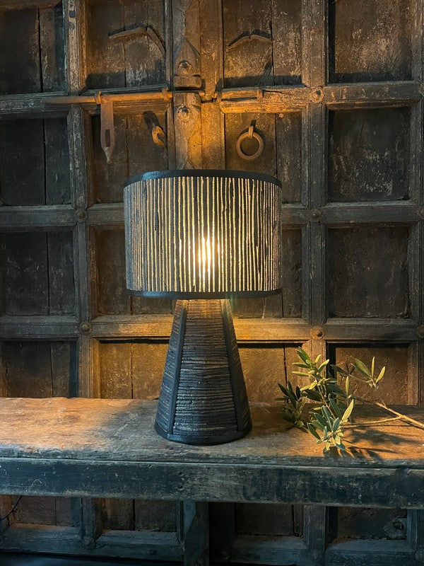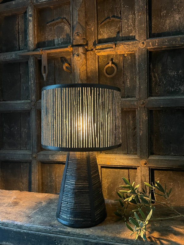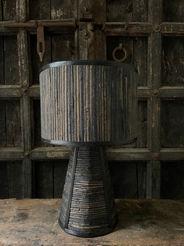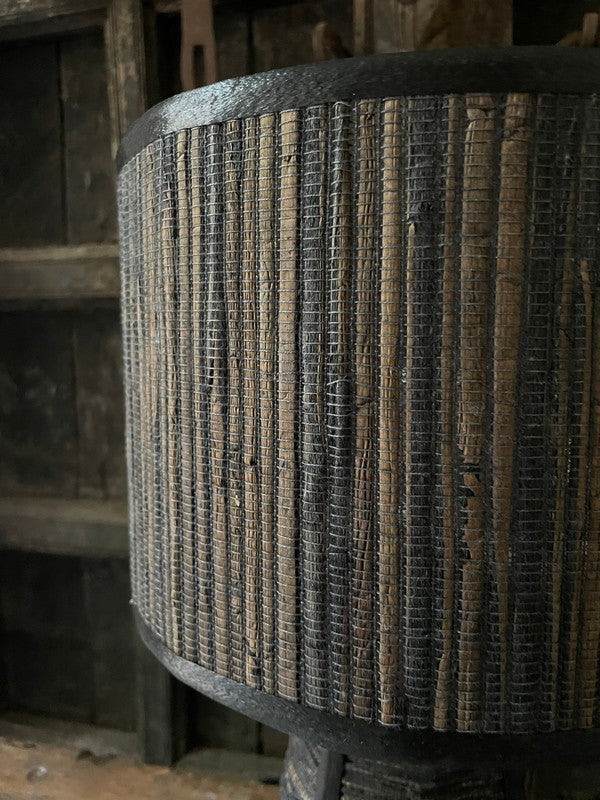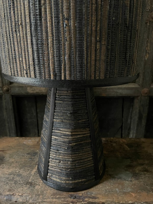 Tafellamp Raffia Natural/Black. Prachtige sobere lamp gemaakt van het natuurlijke materiaal raffia van de bladeren van de raffiapalm, waarbij de bladeren op een natuurlijke manier zijn gekleurd. Deze tafellamp staat niet alleen prachtig op een bijzettafel of dressoir, maar ook op een nachtkastje staat deze heel mooi.