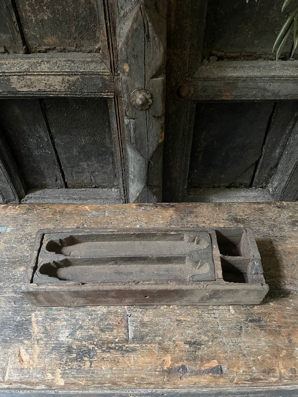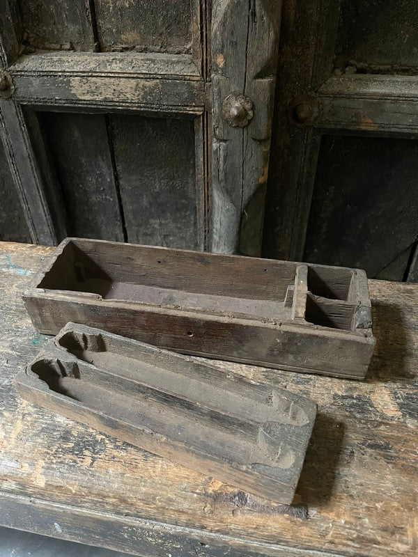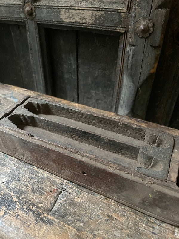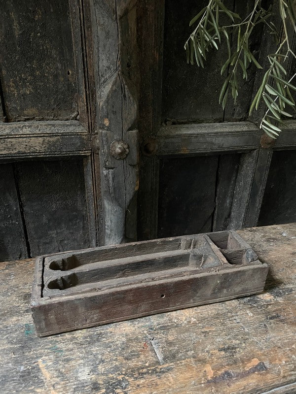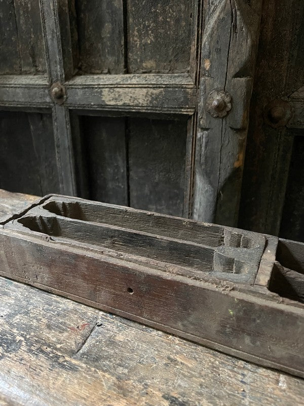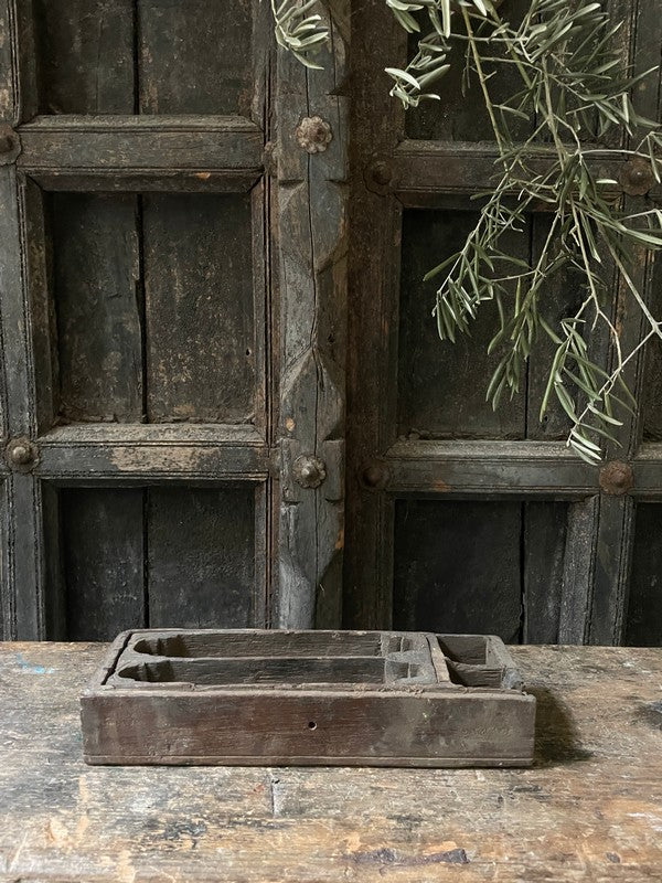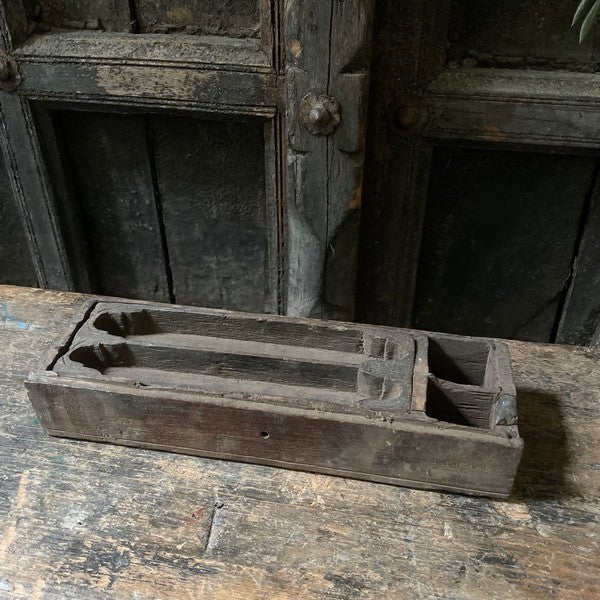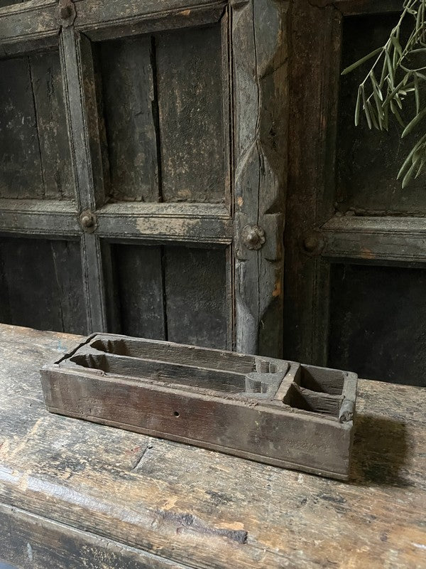 Oude houten bakje uit Nepal. Het bakje kun je uit elkaar halen. Super gaaf om als pennenbakje te gebruiken. Doorleefd en mooi sober.
