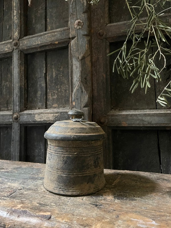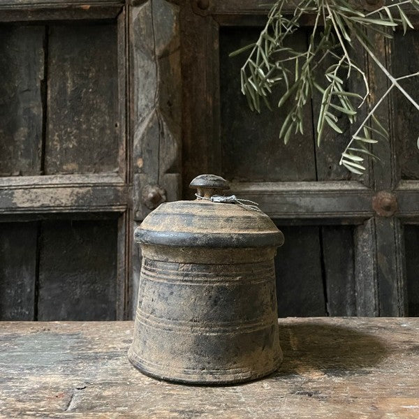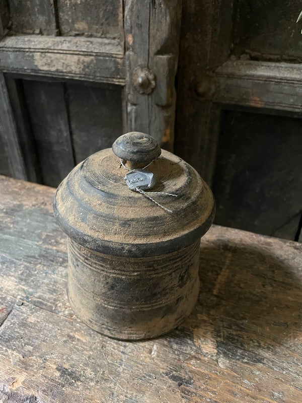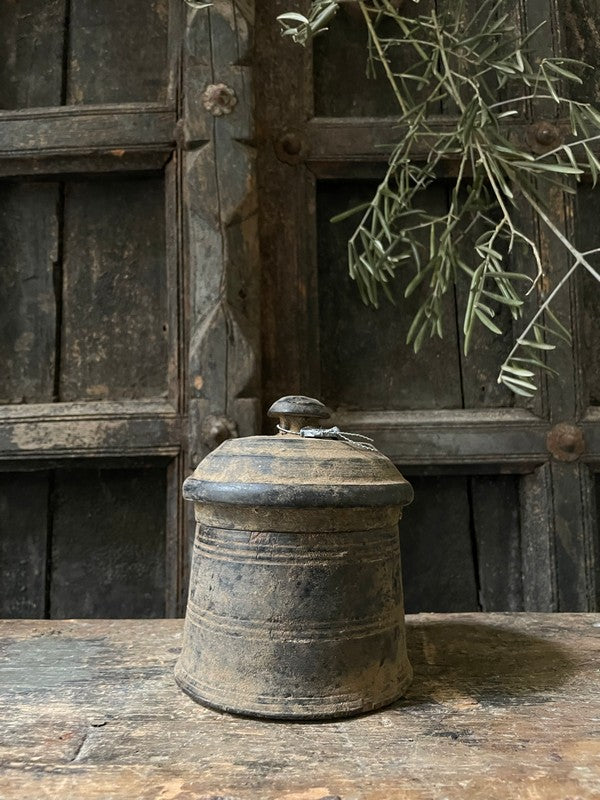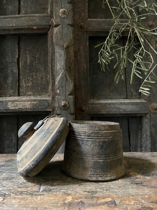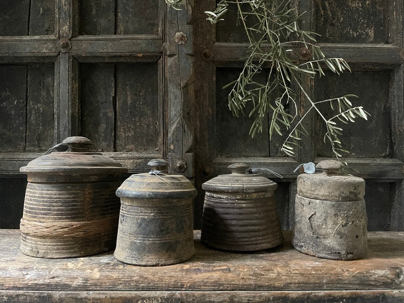 Antigua olla de madera con tapa procedente de Nepal, la segunda por la izquierda en la foto. De una belleza sencilla y con un aspecto envejecido.