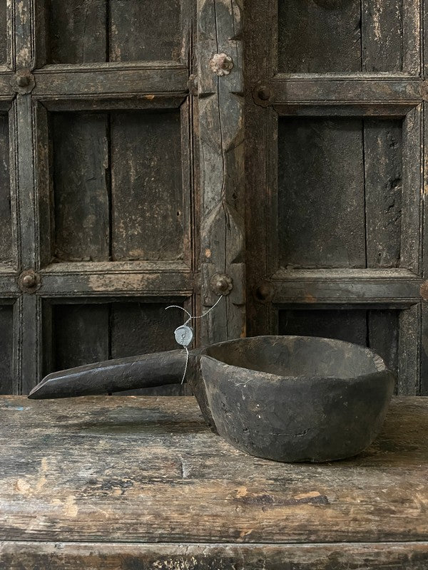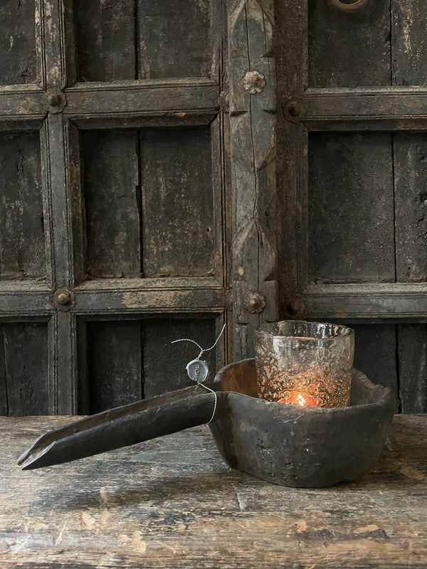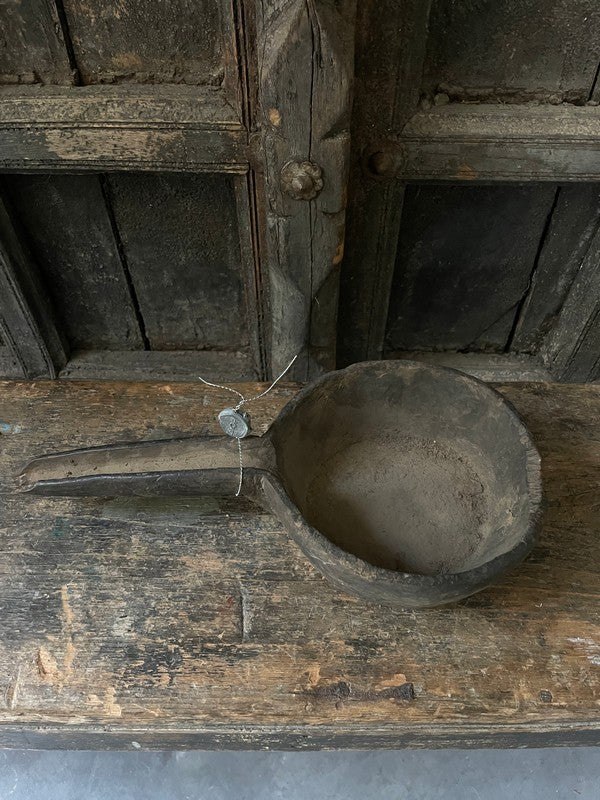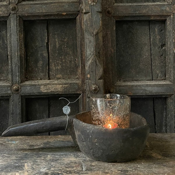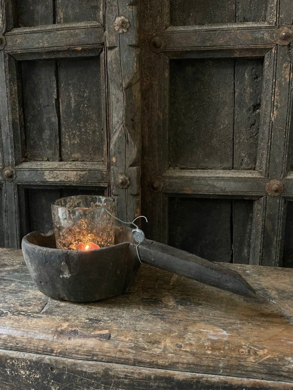 Antiguo cuenco de madera con asa, procedente de Nepal. De aspecto envejecido y sencillo, queda precioso con una linterna o alguna planta.